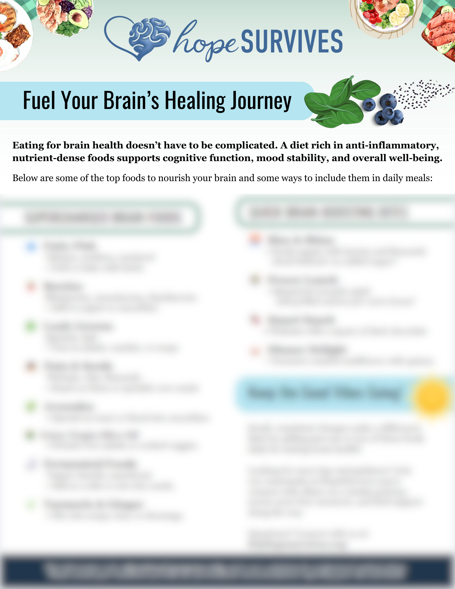 Fueling Your Brain: Anti-Inflammatory Foods Downloadable Resource Mar 1 Written By Hope Survives A guide to nutrition that supports brain health and reduces inflammation. Brain Health NutritionAnti-inflammatory foods for Brain InjuryBest Foods for Brain healingCognitive Function & DietBrain-boosting FoodsHealthy Diet for RecoveryFoods to Reduce InflamationBrain Injury Recovery Diet Hope Survives